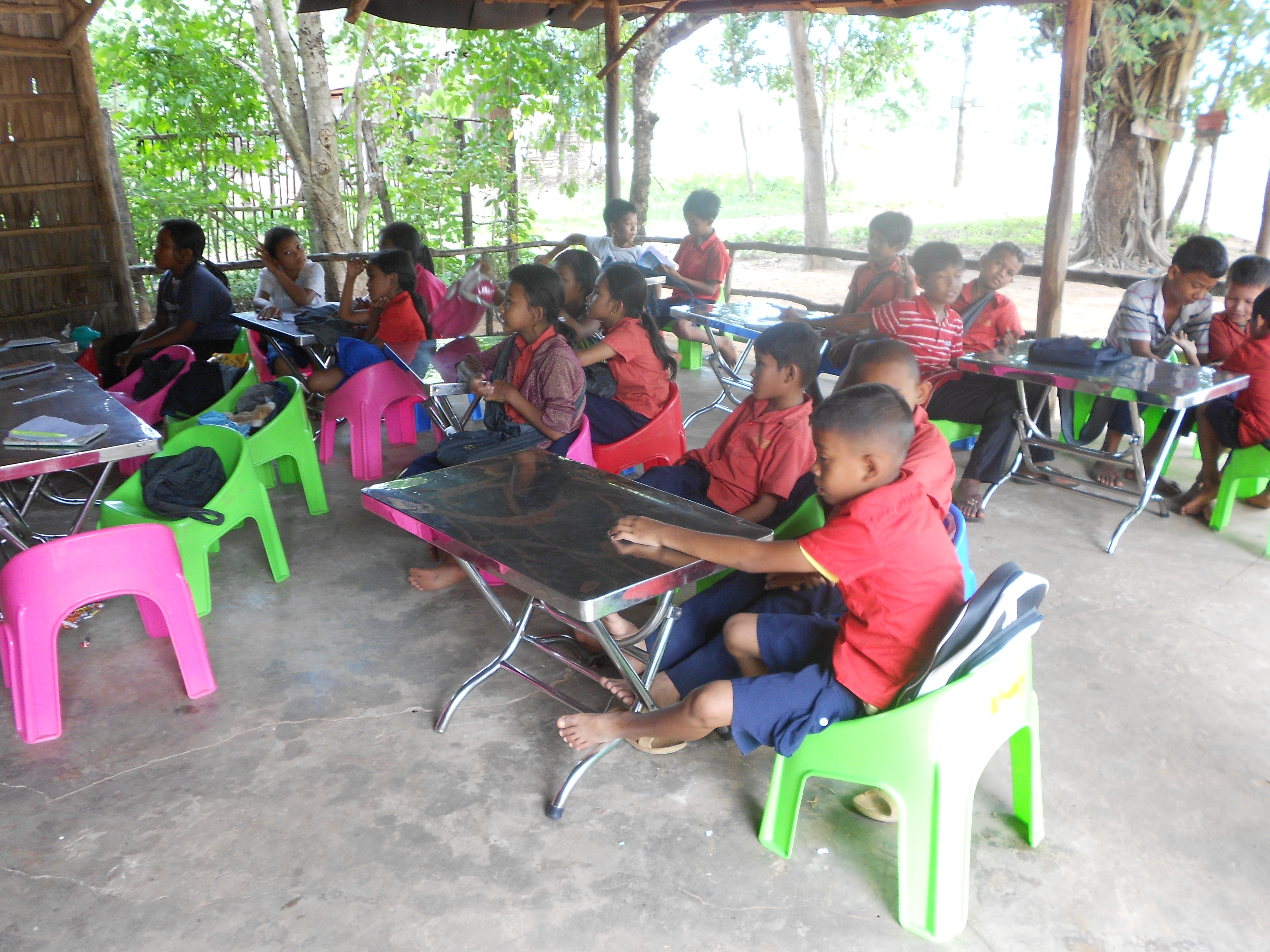 New chairs and desks enjoyed by a class on the verandah.